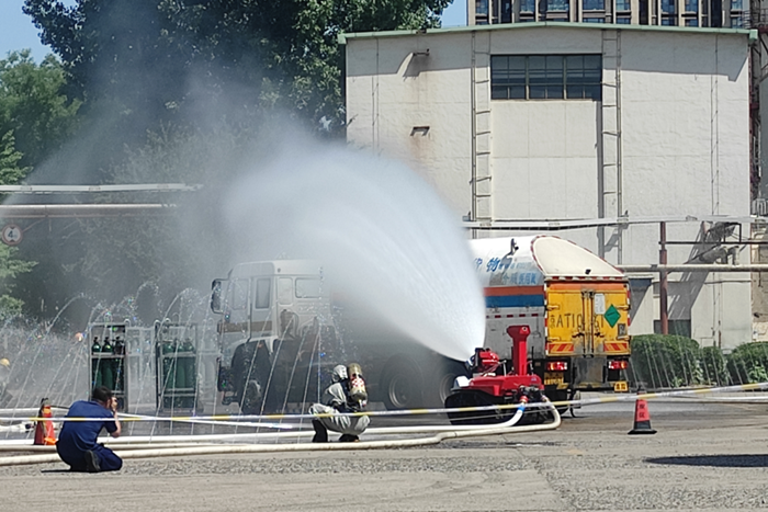 演練場景模擬北普公司院內(nèi)兩名恐怖分子劫持一輛滿載液氧槽罐車沖撞氫氣瓶組存放區(qū),造成液氧槽罐車車頭著火,部分高壓氫氣瓶泄漏、受熱存在潛在爆炸風險。現(xiàn)場兩名人員受傷,駕駛室內(nèi)恐怖分子被困,現(xiàn)場情況不明。