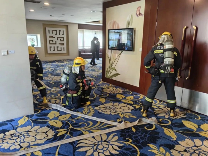 華騰美居酒店順利通過此次檢查考核。檢查結(jié)束后,為提高酒店應(yīng)急救援實戰(zhàn)水平,勁松消防特勤站就地開展了一次火災(zāi)救援現(xiàn)場演練,參演人員由特勤站救援人員和酒店微型消防站義務(wù)救援人員組成。演練取得圓滿成功。