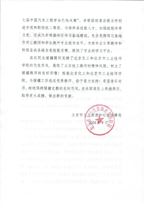 日前,北京市人力資源和社會保障局發(fā)來感謝信。對北京市工業(yè)技師學院教師高樂圓滿完成援疆工作表示誠摯的慰問和衷心的感謝!