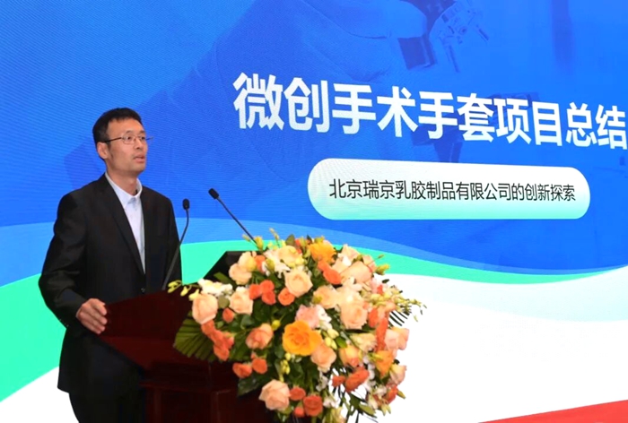 北京瑞京公司研發(fā)工程師仇維高介紹了“雪蓮”微創(chuàng)手術(shù)手套創(chuàng)新研發(fā)過程。