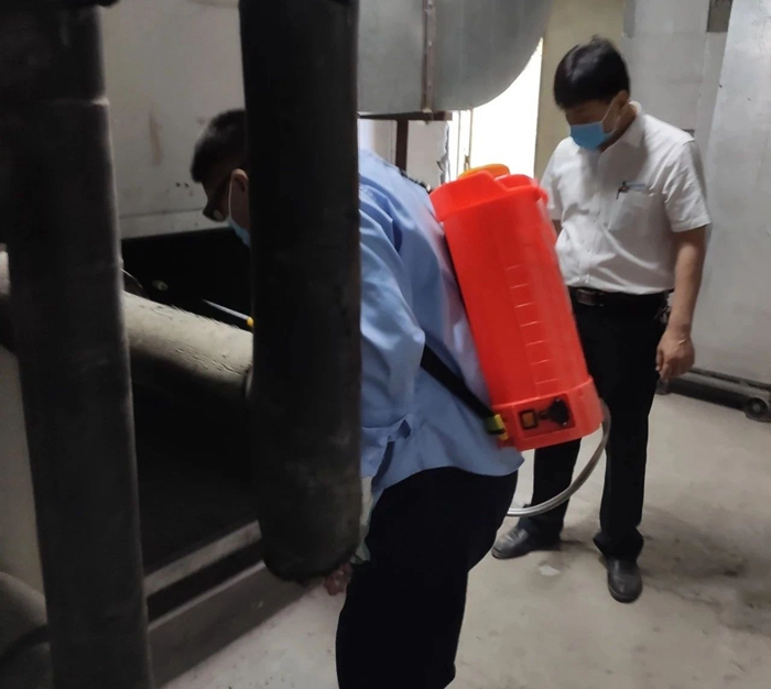 工作人員對華騰新天地商場新風(fēng)機(jī)組進(jìn)行消殺作業(yè)
