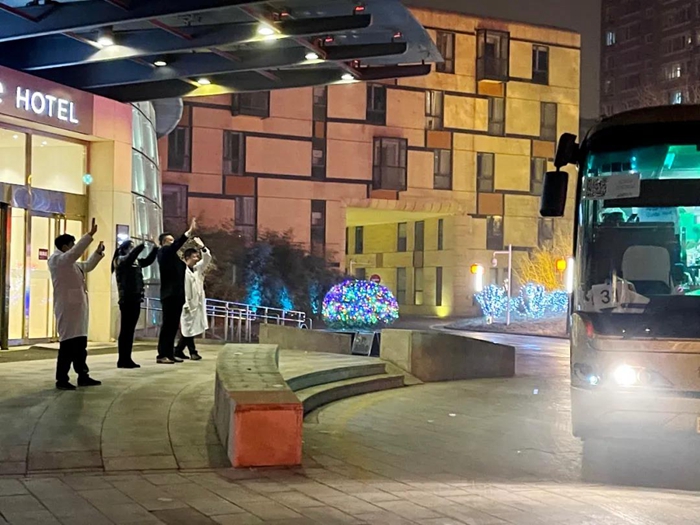 2月12日大年初一夜里,正當(dāng)人們闔家團(tuán)聚喜迎新春之時,華騰美居酒店干部員工卻以“歡送”的方式迎接這一喜慶時刻的到來。此時的華騰美居酒店大堂門前,北化房地產(chǎn)公司黨總支委員、副總經(jīng)理、美居酒店負(fù)責(zé)人白江正與酒店管理人員一起守候在門口,向魚貫而出的人們揮手告別,目送他們踏上回家的大巴車。同樣的一幕在次日的大年初二夜里再次上演。至此,262名隔離人員在華騰美居酒店完成21天隔離觀察,并經(jīng)核酸檢測為陰性后,于2月12、13日大年初一和初二夜里,分兩批全部踏上了返家的路途。