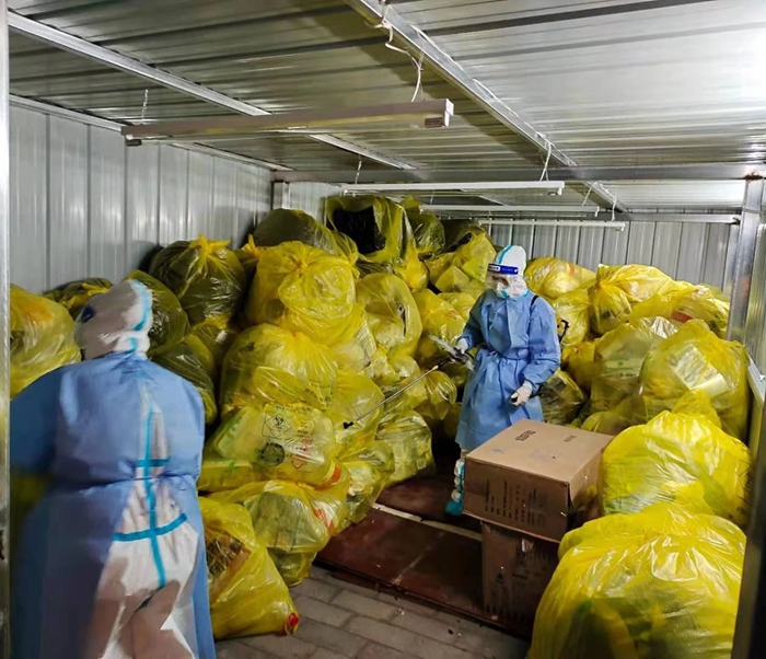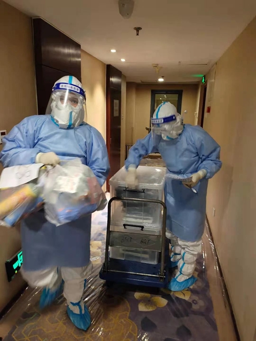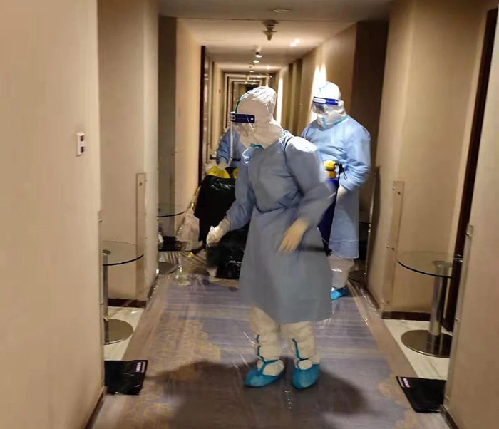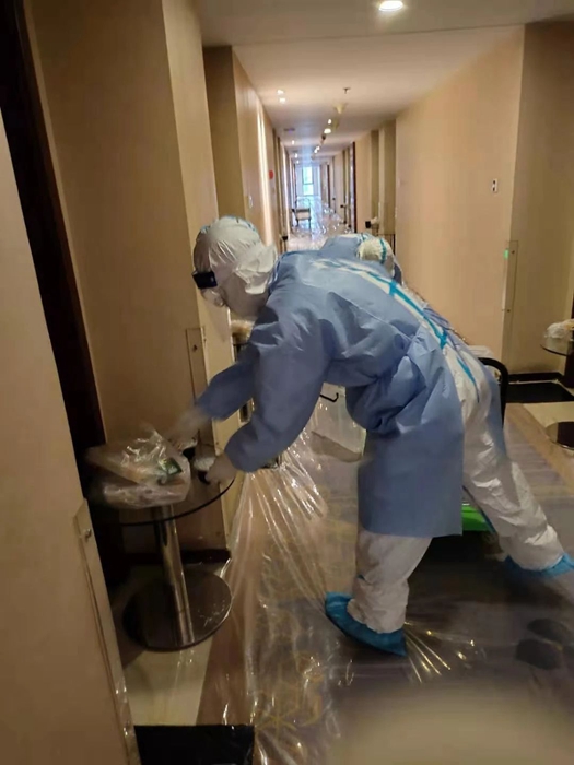 從收到通知到隔離人員全部返家的23天里,共產(chǎn)黨員、酒店負(fù)責(zé)人白江一直在酒店 “坐陣指揮”,最快速解決面臨的各種問題。7名隔離區(qū)消殺組成員每日24時至凌晨3時進(jìn)行垃圾收撿,每日晚餐后還要對公共區(qū)域進(jìn)行全方位消殺,對每天產(chǎn)生的800多公斤醫(yī)療垃圾廢物,收撿后運輸?shù)綄S美娣盘?,進(jìn)行全方位消殺。