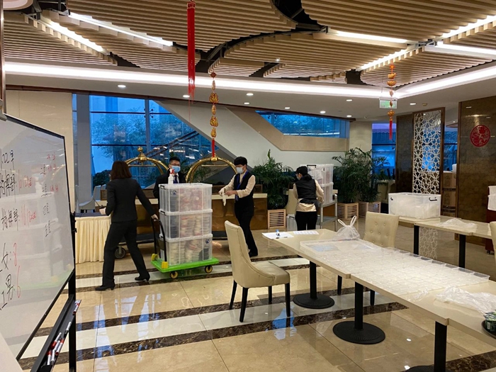 一場按照隔離服務(wù)標(biāo)準(zhǔn)進(jìn)行酒店改造的大會戰(zhàn)隨即打響。從酒店區(qū)域劃分到人員分配培訓(xùn),從制定用餐標(biāo)準(zhǔn)到采購所需物資,從接待程序到后勤保障……在領(lǐng)導(dǎo)小組的直接指揮下,每一項工作逐一明確責(zé)任,每一項細(xì)分事項逐一落實到人、到物……一場涉及全酒店的系統(tǒng)改造工程就在這緊張忙碌,卻不失有序的氛圍中全面鋪開,從艷陽高照到日薄西山,從華燈初上到到夜深人靜……酒店全體員工通宵投入到改造中,華騰美居酒店迎來了一個不眠之夜。