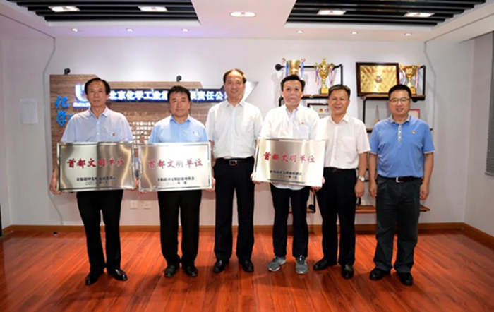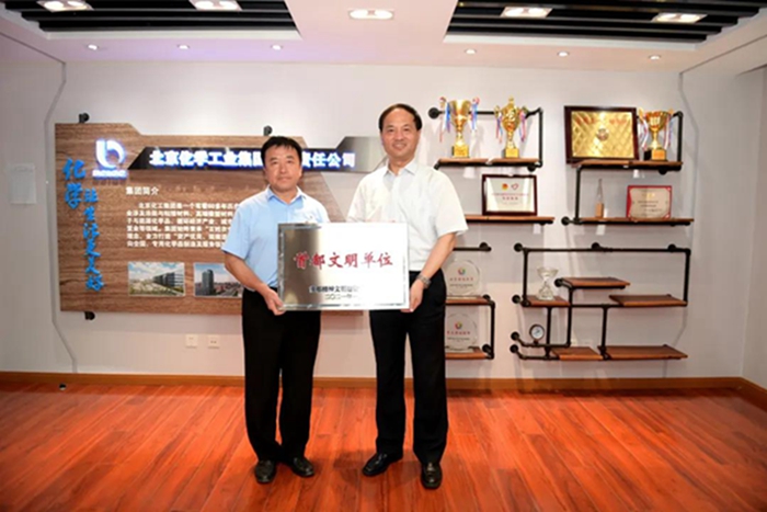 9月1日,北京化工集團(tuán)黨委書記、董事長(zhǎng)王國華向獲首都文明單位稱號(hào)的3個(gè)單位授牌,黨委副書記吳瑞峰,總經(jīng)理助理、華騰拓展公司黨總支書記李泳,化研院黨總支書記楊傳忠,華騰天海公司黨總支書記崔志宏參加授牌儀式。
