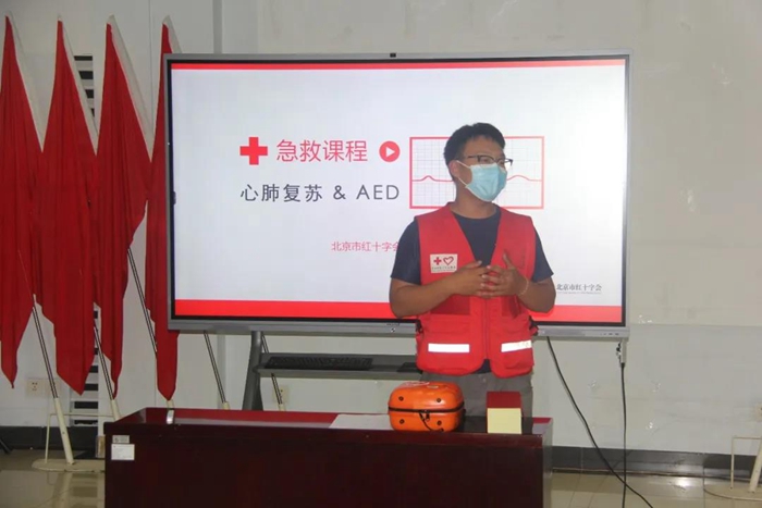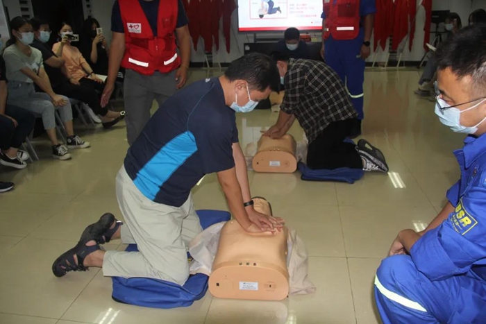 培訓現(xiàn)場,紅十字會講師講解了意外情況下的心肺急救知識,并利用模擬假人詳細講解了心肺復蘇術(shù)和自動體外除顫器(AED)的操作要領。