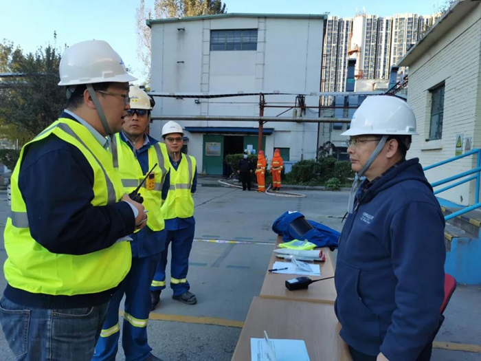 演練人員全部是一線人員。崗位人員發(fā)現(xiàn)氫氣瓶“突發(fā)火情”后,緊急發(fā)出警報(bào),設(shè)置隔離警戒,現(xiàn)場排查,進(jìn)行初級處置,隨后現(xiàn)場指揮系統(tǒng)啟動(dòng),專業(yè)處置、疏散撤離、與消防等外部支援力量的合作等一系列安全措施有序展開,操作流暢、協(xié)調(diào)到位、環(huán)節(jié)緊湊。