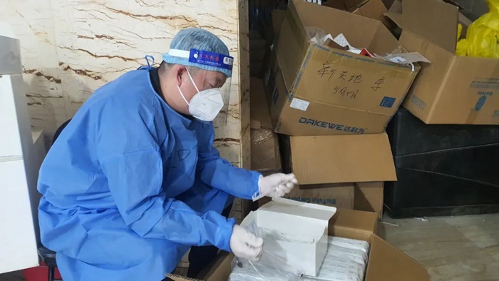 不等社區(qū)同志手把手教,我就掌握了穿脫防護(hù)服、84消毒液配比等工作的方法,又經(jīng)現(xiàn)場(chǎng)緊急培訓(xùn)學(xué)習(xí)了維持秩序、身份信息登記、開箱封箱等方法。很快我就上手開始了緊張而忙碌的工作。