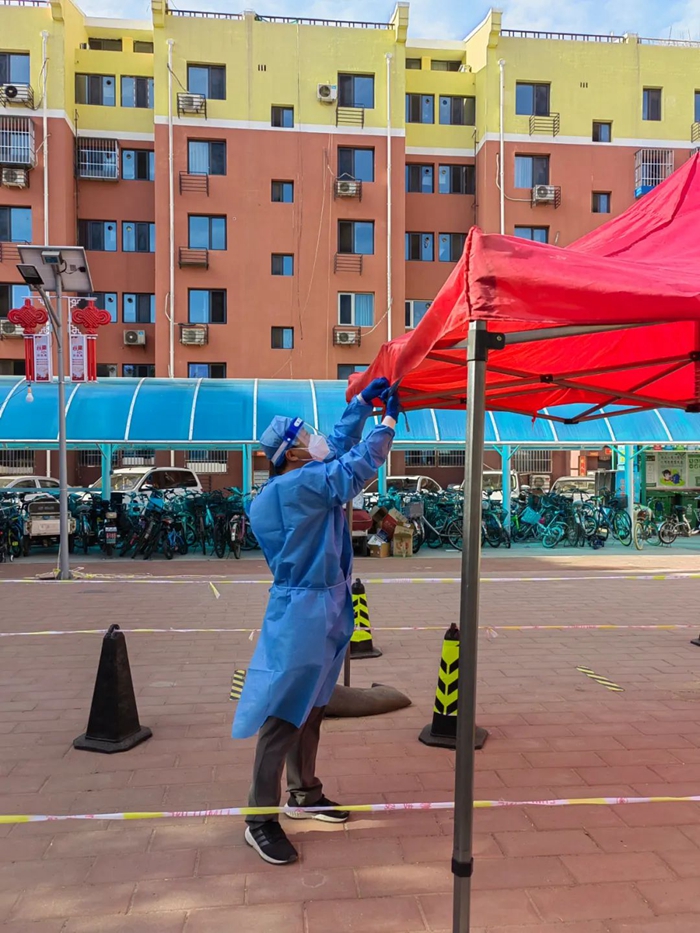 每天早上天剛亮,我就和居委會(huì)的工作人員一起來到小區(qū)的廣場(chǎng)集合,穿戴好防護(hù)用具,搭建好臨時(shí)遮陽(yáng)棚、拉好警戒線、擺放好檢測(cè)試管和棉簽……為核酸安全采樣做好前期準(zhǔn)備工作。