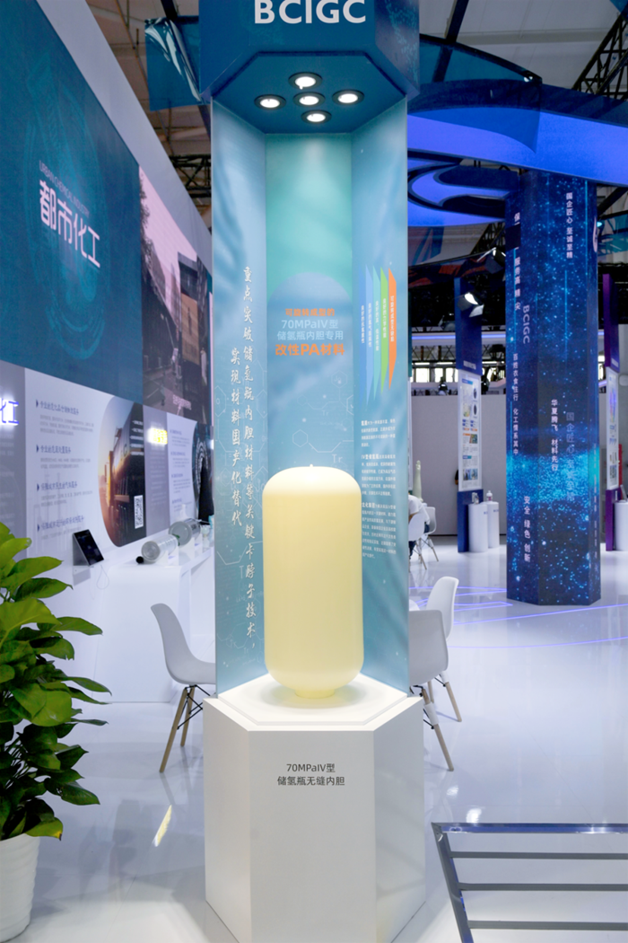 剛剛邁入北京化工集團(tuán)展位所在的4號(hào)展廳,在大門(mén)左側(cè),近1米高的儲(chǔ)氫瓶?jī)?nèi)膽吸引了觀展人群的目光,由集團(tuán)所屬華騰京研公司正在研制的,重點(diǎn)突破儲(chǔ)氫瓶?jī)?nèi)膽關(guān)鍵材料等 “卡脖子”技術(shù)的內(nèi)膽實(shí)物,將人們引進(jìn)北京化工集團(tuán)的展位。