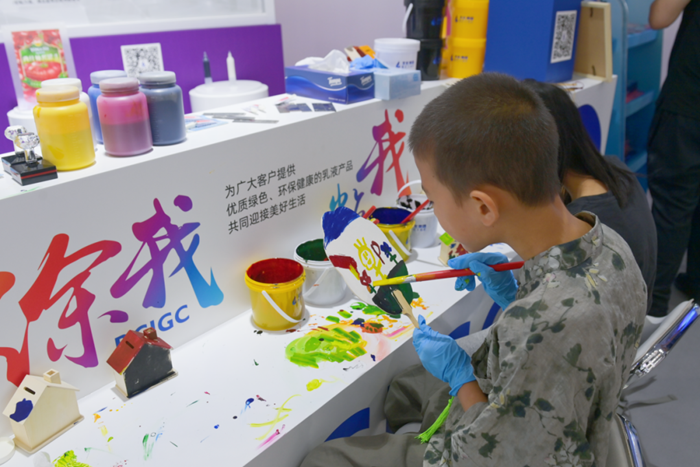在“涂我、粘我”展區(qū),大朋友、小朋友們紛紛拿起小扇子、小木制房子,用不同的涂料在上面作畫(huà)、上顏料;在干箱手套互動(dòng)區(qū),觀展者興致勃勃地套上干箱手套,模擬化學(xué)試驗(yàn)操作,將試劑滴入不同化學(xué)液體中,觀察其中的變化;在防靜電手套互動(dòng)區(qū),觀眾們紛紛體驗(yàn)不戴手套的“麻酥”感和戴上手套后的安全感。3個(gè)互動(dòng)區(qū)使觀展者在動(dòng)手參與中了解產(chǎn)品的特性,對(duì)化學(xué)讓生活更美好有了切身的感受。