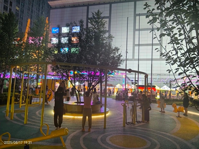 夏日傍晚,位于東四環(huán)的華騰新天地商場前,繽紛夜市+休閑廣場,周邊居民享受著夏日晚間的熱鬧繽紛與閑暇舒適。